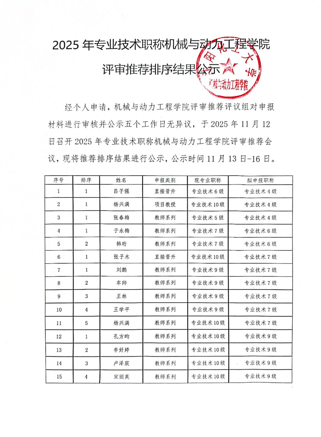 2025年专业技术职称机械与动力工程学院评审推荐排序结果公示